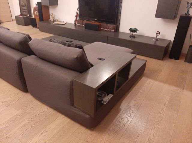 Divano completamente sfoderabile e lavabile. possibilità di abbinare mobile salotto lunghezza 4 metri con finitura venata in rovere grigio della stessa finitura del divano, cassettoni laterali e anta centrale per nascondere gli impianti, porta TV a parete con retro illuminazione, parte superiore con apertura push-pull