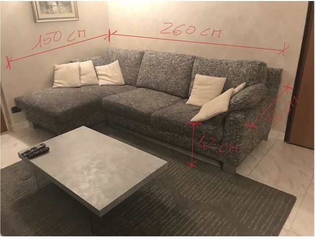 Dettagli del prodottoAmpio divano angolare con piedini in acciaio colore grigio e bianco, sfoderabile e lavabile. Cerniera difettosa cuscino angolo. Buonissime condizioni e molto comodo. 6 cuscini bianchi e tappeto omaggio. Ritiro a carico dell'acquirente.