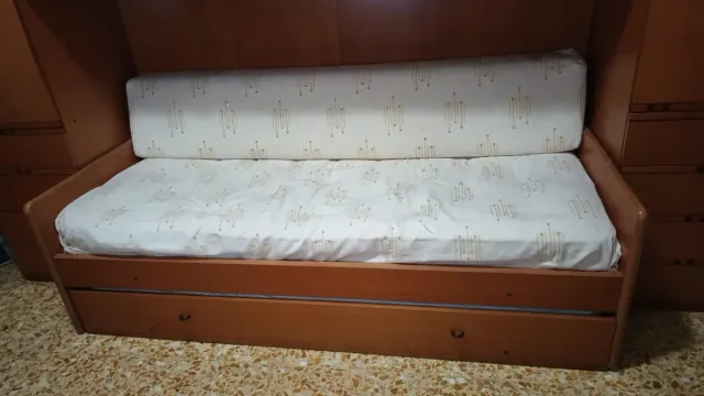 Dettagli del prodottoDivano letto in legno con un design semplice e funzionale, perfetto per una cameretta o come soluzione salvaspazio.