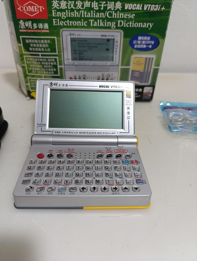 Dettagli del prodottoDizionario elettronico Vocal VT03i+ di COMET, ha tre lingue inglese, italiano e cinese, incluso di custodia, cuffie mai utilizzate e la pennina, è funzionante ma lo schermo purtroppo ha dei problemi come da foto, le pile non sono incluse