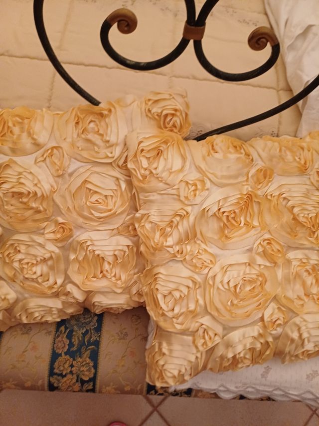 Due cuscini arredo in raso con fiori a rilievo