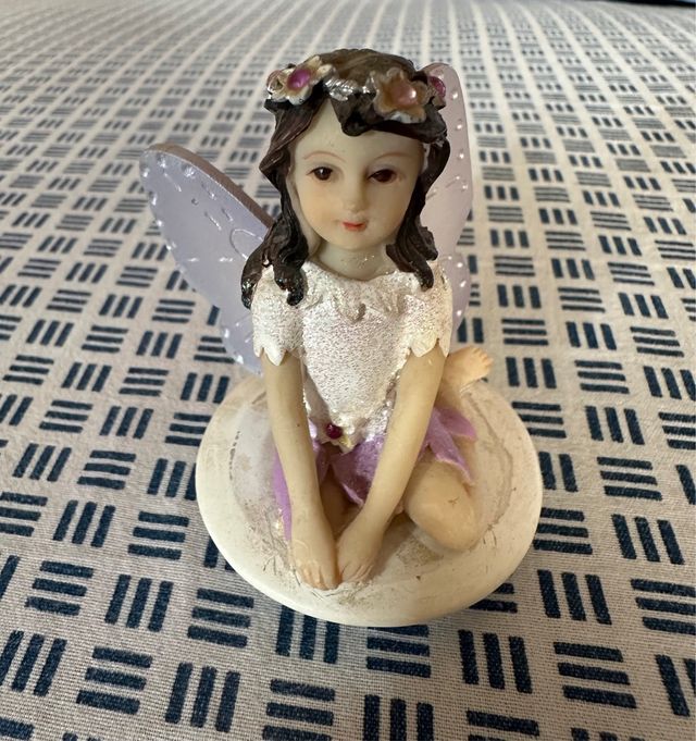 • Una fatina seduta con ali lilla, vestito glitterato e coroncina di fiori.