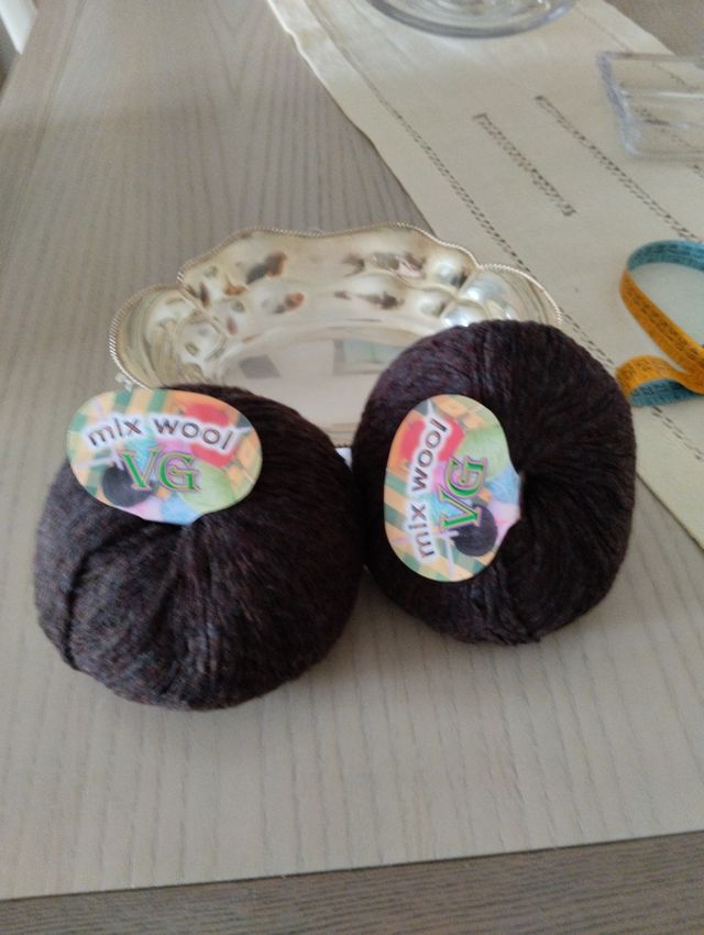Due gomitoli di lana marrone melange da 100 g ciascuno.60 % lana e 40% acrilico.