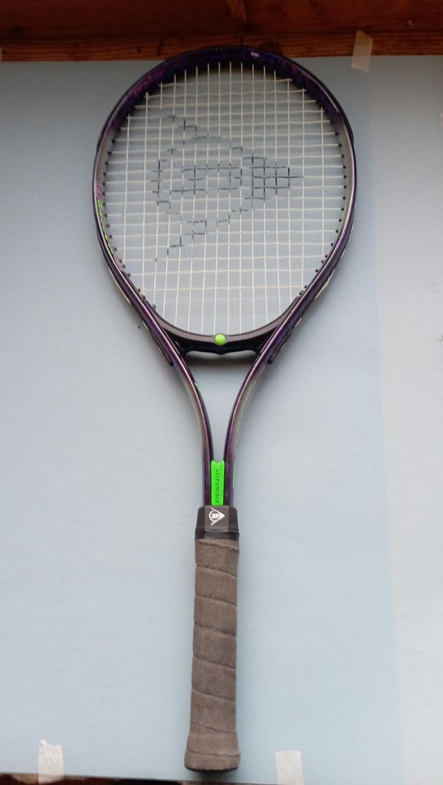 Racchetta da tennis Dunlop Power Master. - Colore viola e verde. - Impugnatura grigia.