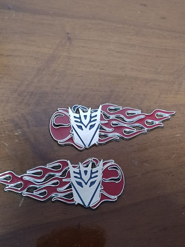 Set di due emblemi dei Transformers con design a fiamma. - Emblemi in metallo con finitura lucida. - Design iconico dei Transformers. - Colore rosso e argento.
