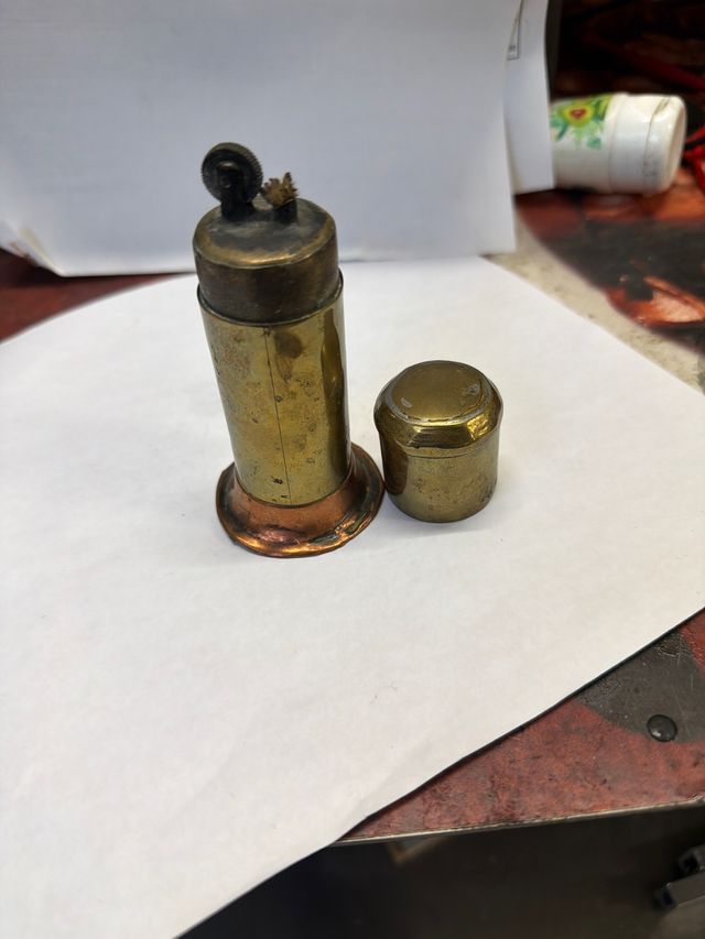Dettagli del prodottoQuesto è un accendino antico, con un design classico e una finitura in ottone che gli conferisce un tocco vintage. Corpo principale in ottone. Base in rame. Tappo abbinato. La descrizione è stata tradotta automaticamente.