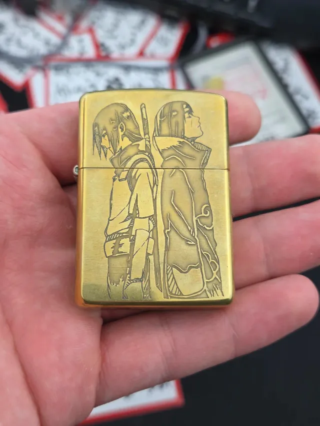 Accendino Zippo con incisione dettagliata di Itachi Uchiha. Design anime. Materiale metallico dorato.
