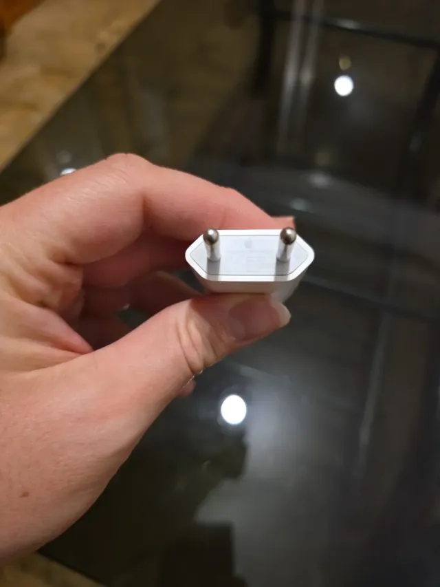 Adattatore di corrente Apple. Design compatto e bianco. Due spine per la connessione.