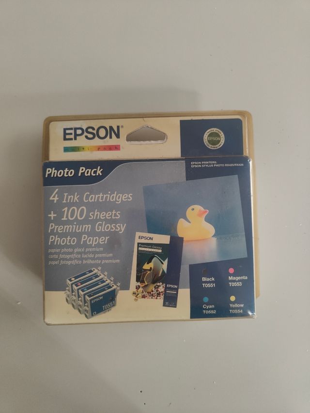 Pacchetto foto Epson nuovo e sigillato. - Include 4 cartucce d'inchiostro. - 100 fogli di carta fotografica lucida premium.