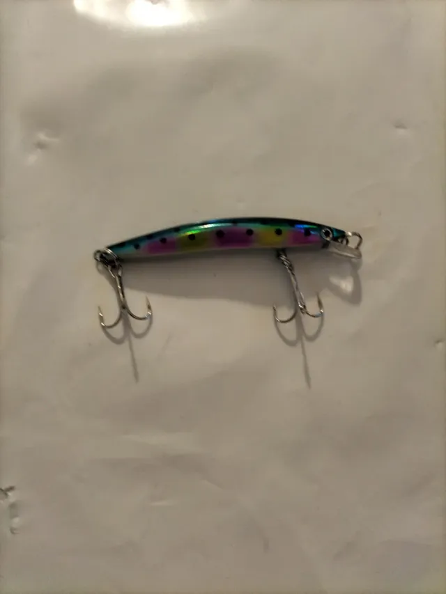 Esca artificiale per spinning con un design iridescente e puntini colorati. - Colori vivaci e riflettenti. - Dotata di due ancorette. - Ideale per la pesca.