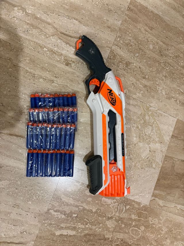 Dettagli del prodottoFucile Nerf Roughcut 2x4 in buone condizioni. Include 4 pacchetti di pallini = 40 pallini. Colore bianco, arancione e nero. Design ergonomico. La descrizione è stata tradotta automaticamente.