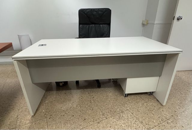 Scrivania dal design moderno con finiture in bianco e grigio. Superficie ampia e liscia. Gambe robuste a forma di L. Cassetti con ruote. Ritiro solo a Les Corts, non spedito.