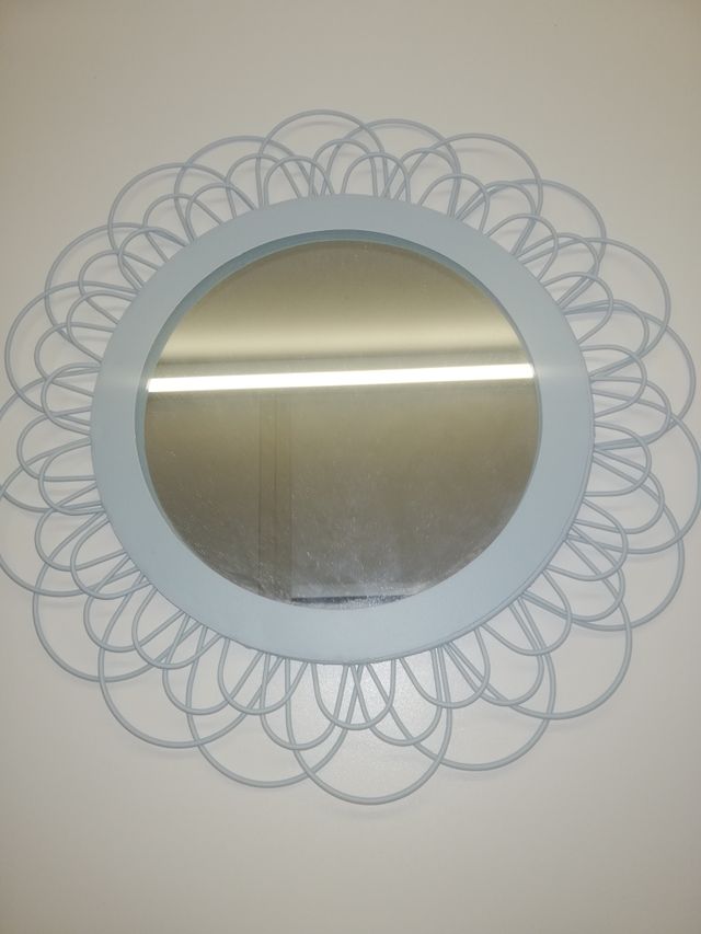 Dettagli del prodotto2 specchi metallici rotondi di colore blu-verde, 18 cm di diametro dello specchio, diametro totale 31 cm.