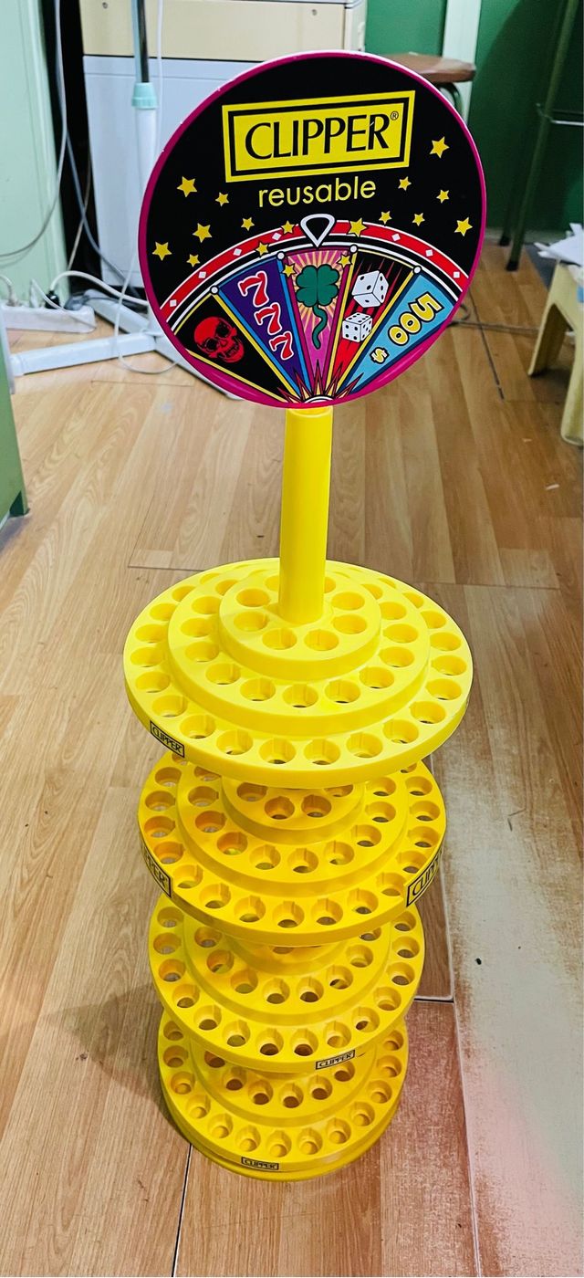 Dettagli del prodottoEspositore per accendini Clipper completo di 4 piani da 48 posti, base girevole e puntale Clipper Misure del prodotto