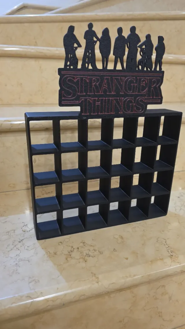 Espositore a tema Stranger Things con i personaggi. - Design a griglia con 25 vani. - Personaggi stilizzati in silhouette. - Scritta Stranger Things in rilievo.