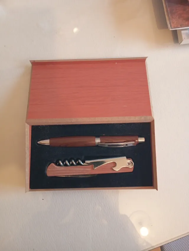 Dettagli del prodottoElegante custodia in legno con penna e cavatappi.