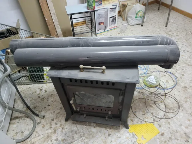 In vendita è una stufa a legna con due tubi di uscita fumi. - Stufa in ghisa - Include due tubi metallici grigi.