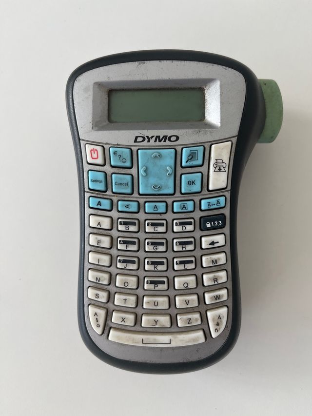 Etichettatrice Dymo con tastiera QWERTY e display. - Tasti per lettere, numeri e simboli. - Funzioni di impostazione e annullamento.
