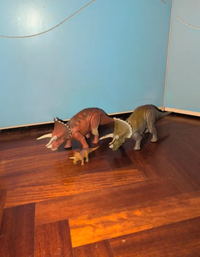 Dettagli del prodottoSet di tre dinosauri Triceratops, ispirati a Jurassic World. Include un esemplare adulto più grande e due più piccoli.