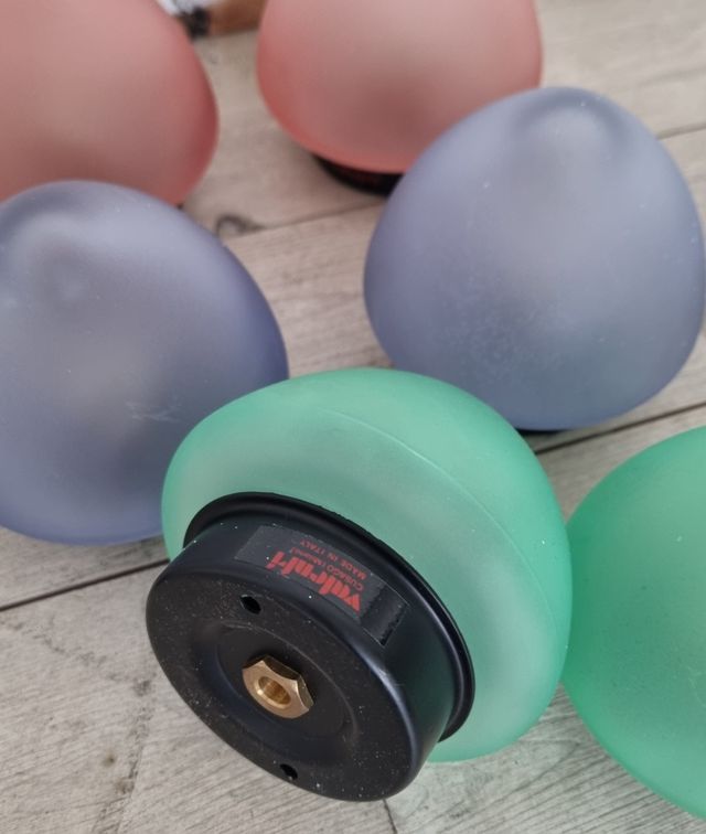 Dettagli del prodottoFaretti in vetro opalino colorato di Valenti risalenti agli anni 90, mai usati, come nuovi.