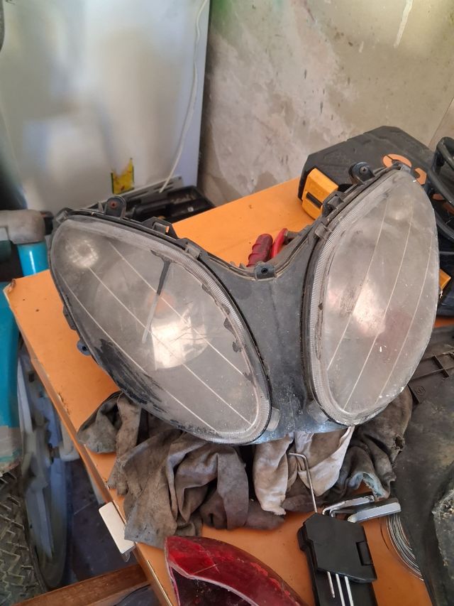 Dettagli del prodottoDoppio faro per Piaggio nrg power anteriore per moto, con lenti trasparenti e struttura in plastica nera.