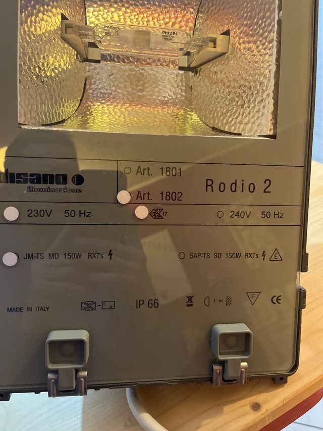 Dettagli del prodottoProiettore con corpo senza telaio in alluminio pressofuso con alettature di raffreddamento, riflettore asimmetrico in alluminio martellato 99.85 ossidato anodicamente spessore 3µ e brillantato, diffusore in vetro temperato sp. 5 mm resistente agli shock termici e agli urti (prove UNI EN 12150-1:2001) e portalampada in ceramica con contatti argentati. Fornito con: guarnizione di gomma siliconica; pressacavo in nylon f.v. Ø 1/2 pollice gas; viterie in acciaio imperdibili, anticorrosione e antigrippaggio; staffa in acciaio con scala goniometrica; vetro frontale, apribile a cerniera senza l’uso di utensili, rimane agganciato al corpo dell’apparecchio; valvola di ricircolo aria; ganci di chiusura in acciaio AISA316L con vite di sicurezza. W totali 166, Lumen-K-CRI JM-TS 150 12500lm-4200K-Ra 1b. Modello 1801 Rodio 2 asimmetrico, marchio Disano Illuminazione Misure del prodotto