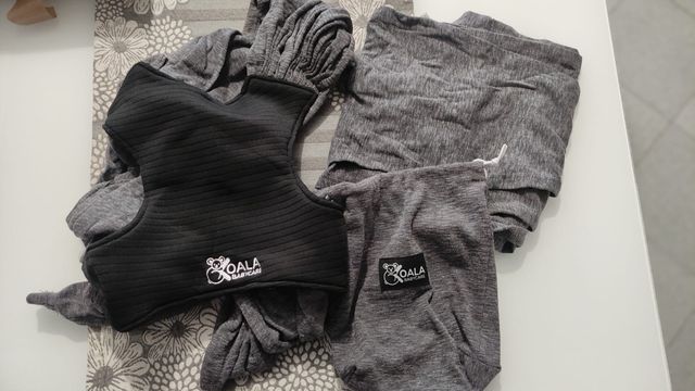 Fascia porta bebè Koala Babycare in tessuto grigio melange. Include sacca porta fascia. - Tessuto morbido e traspirante. - Design ergonomico. - Adatta per neonati.