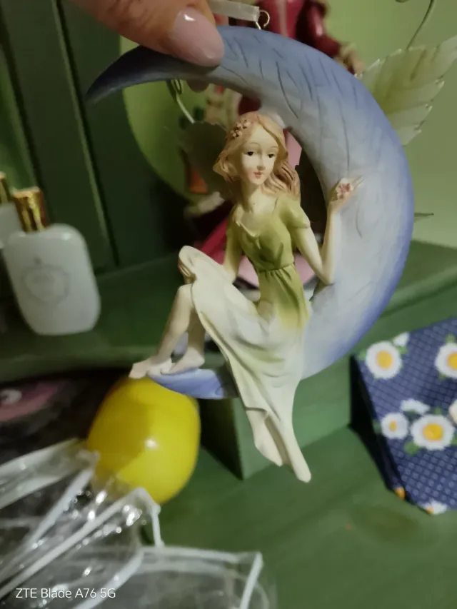Deliziosa fata da appendere, perfetta per decorare. - Fata seduta su una luna. - Dettagli curati e colorati.