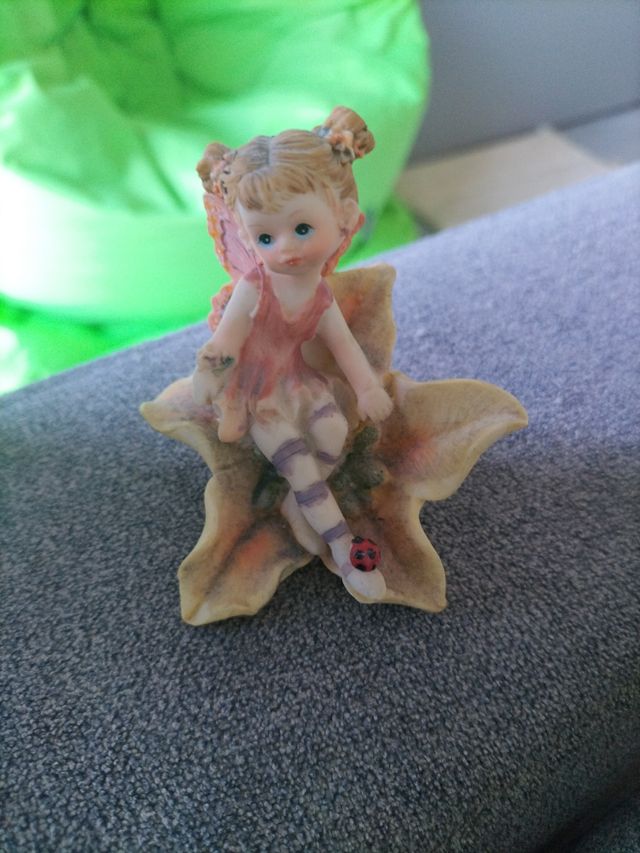Dettagli del prodottoBellissima statuetta di una fatina seduta su una foglia.