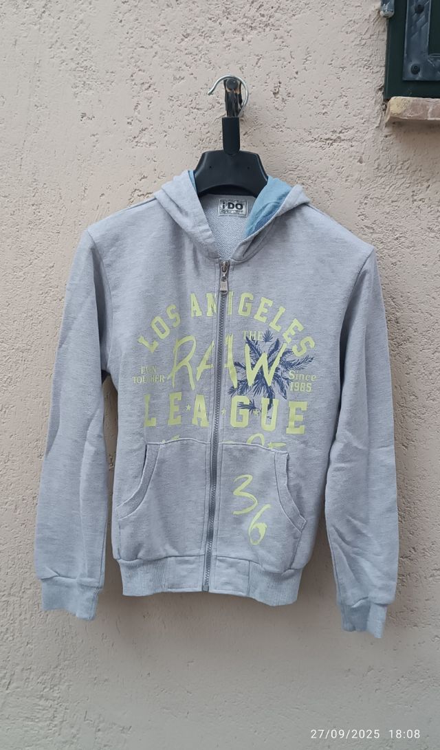 Dettagli del prodottoFelpa grigia con cappuccio per bambino, taglia 10 anni, con stampa Los Angeles Raw League. Ottime condizioni. Marca iDO.