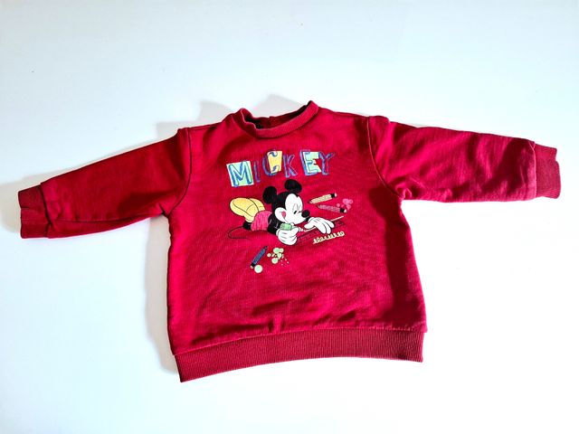 Dettagli del prodottoFelpa bambino, Disney. Colore rosso, disegno Topolino, Mickey Mouse. Taglia 9-12 mesi, 74 cm. In cotone. Ottime condizioni Misure del prodotto