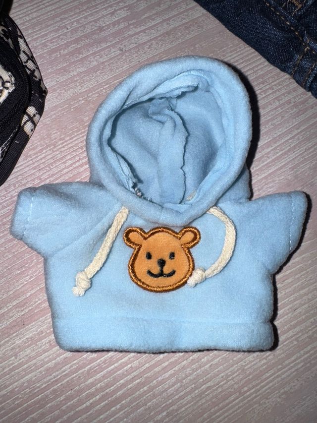 Dettagli del prodottoVendo una tenera felpa con cappuccio per bambole. È di colore azzurro chiaro ed è decorata con un ricamo a forma di orsetto. La felpa è realizzata in pile morbido.
