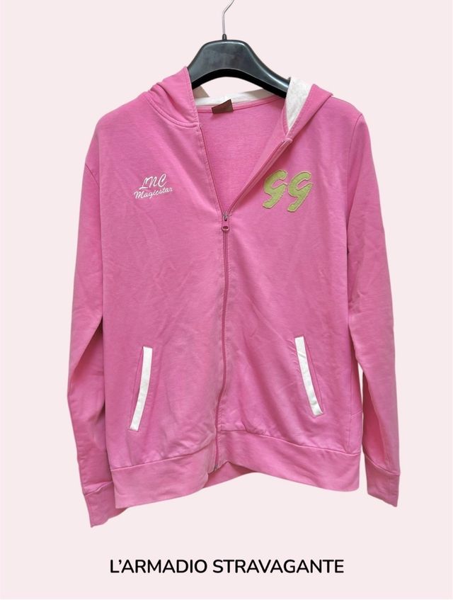 Dettagli del prodottoLa felpa mostrata nelle immagini è una felpa con cappuccio di colore rosa acceso, dallo stile sportivo e casual.