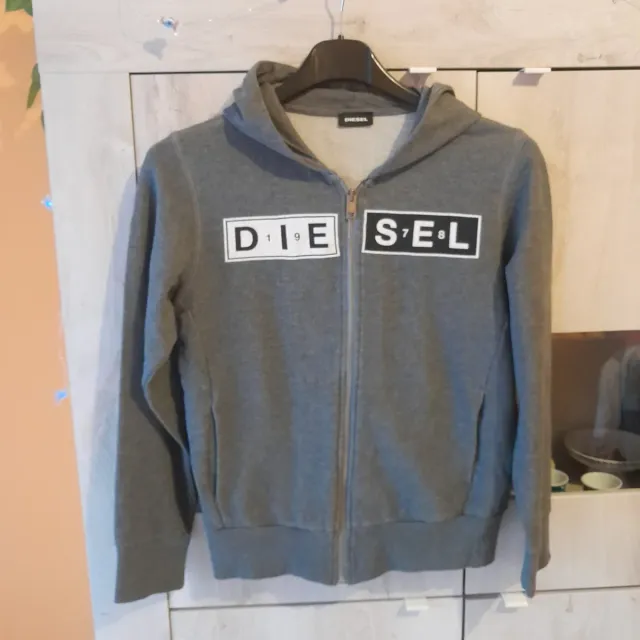 Felpa grigia con cappuccio e zip, perfetta per un look casual. - Logo DIESEL stampato sul davanti. - Tasche laterali. - Polsini e fondo a costine.