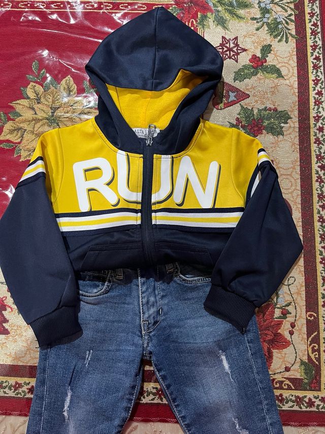 Set composto da felpa con cappuccio e jeans per bambino. - Felpa gialla e blu con zip e scritta RUN. - Jeans blu con strappi.