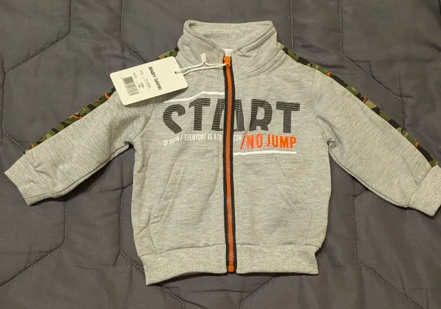 Completo composto da felpa grigia con zip, maglia a maniche lunghe bianca e pantalone militare. Vendilbili anche separatamente