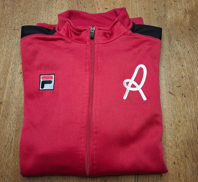 Colore rosso con dettagli neri sulle spalle e logo Fila sul petto.