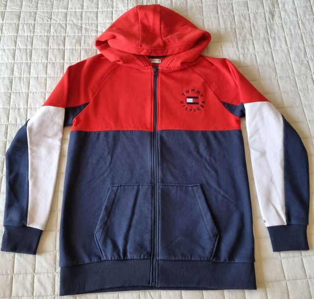 Felpa tommy hilfiger junior con cappuccio e chiusura lampo, cm 176, ottimo stato, colore bianco blu e rosso, in cotone