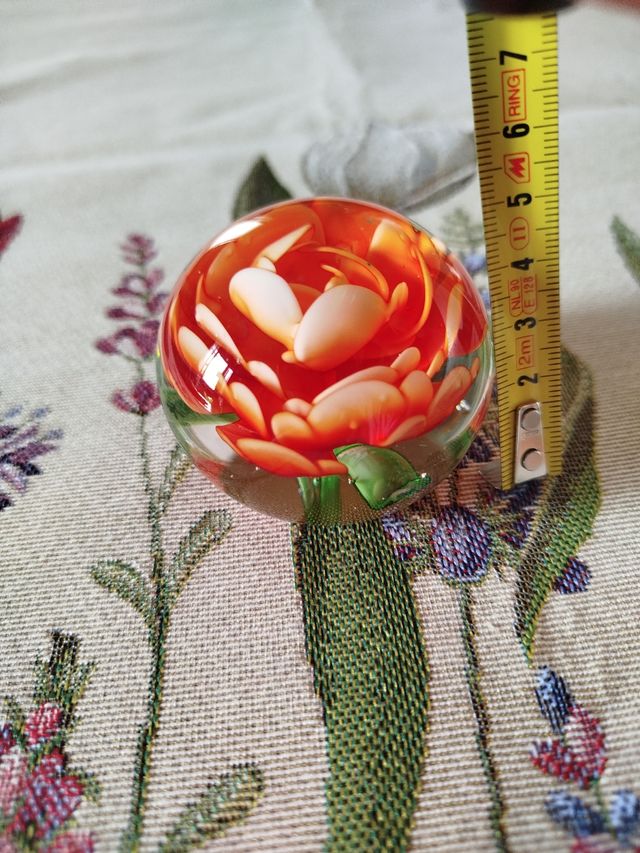 Bellissimo fermacarte in vetro con un fiore arancione e bianco al suo interno. - Realizzato in vetro trasparente. - Fiore interno in vetro colorato.