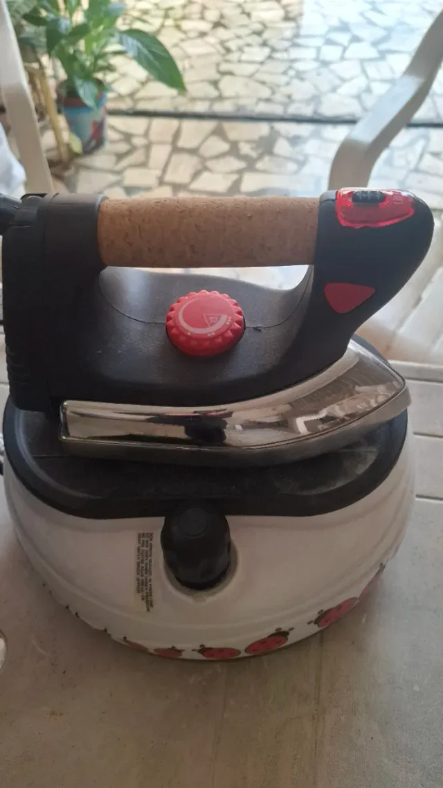 Ferro da stiro Termozeta Coco usato, con una potenza di 2000W. - Design con impugnatura in sughero. - Base in metallo lucido. - Base decorata con coccinelle.