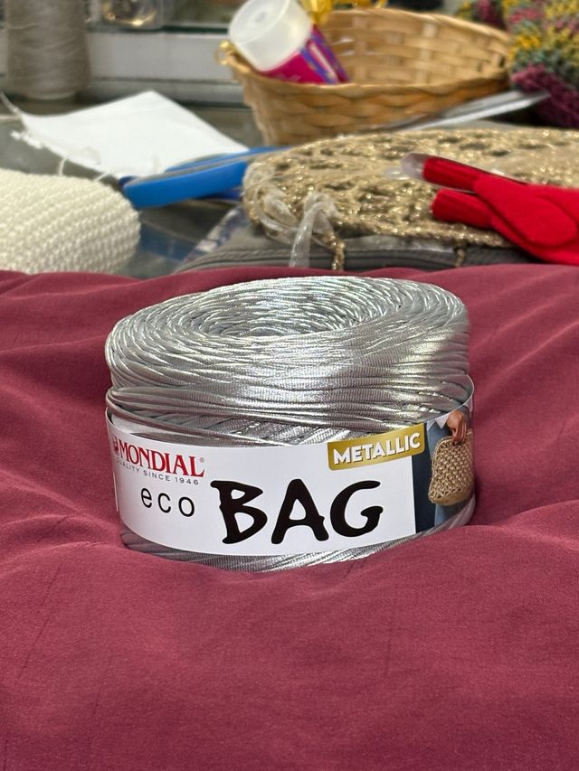 Dettagli del prodottoGomitolo di fettuccia Mondial Eco Bag, colore argento metallizzato. 300 grammi. Colore a scelta, argento o oro