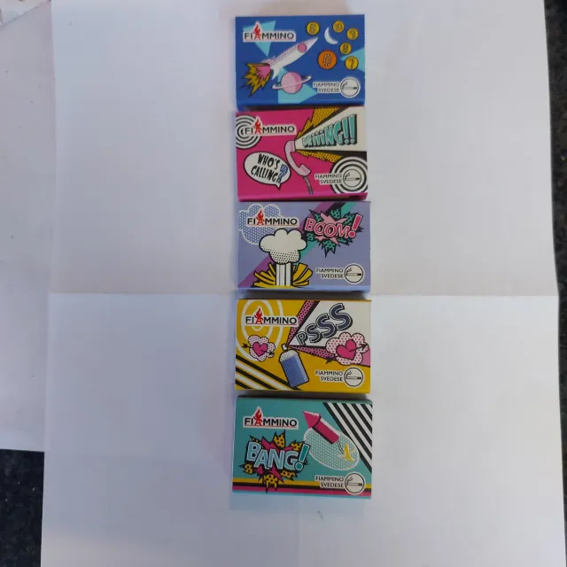 Dettagli del prodottoSet di 5 scatole di fiammiferi Fiammino Svedesi, con design a tema fumetto.