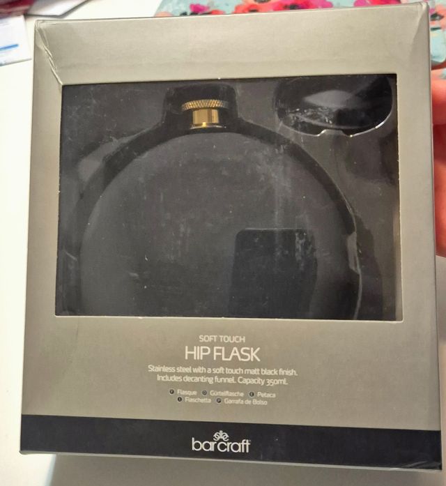 Fiaschetta da tasca Barcraft Soft Touch in finitura nero opaco. - Realizzata in acciaio inossidabile. - Include imbuto per il travaso. - Capacità 350ml.