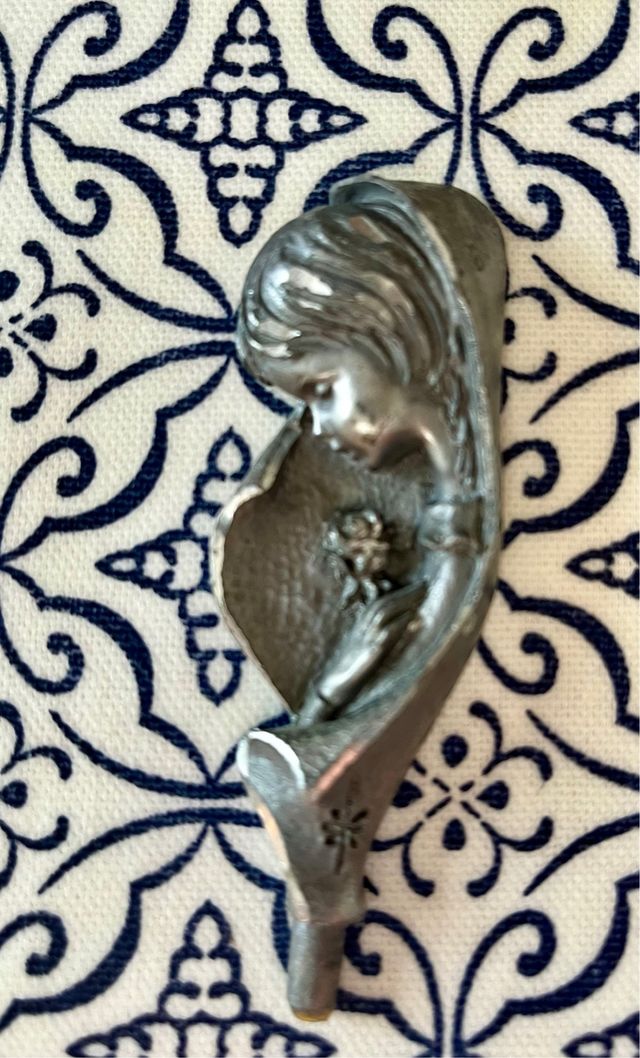 Dettagli del prodottoBellissima figura sacra in stagno, raffigurante una giovane donna con un fiore. - Realizzata in metallo, presenta dettagli raffinati. - Perfetta per collezionisti o amanti dell'arte sacra. - Le sue dimensioni sono contenute, ideale come soprammobile. cm9