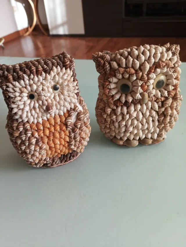 Figure di gufi in conchiglie cauri