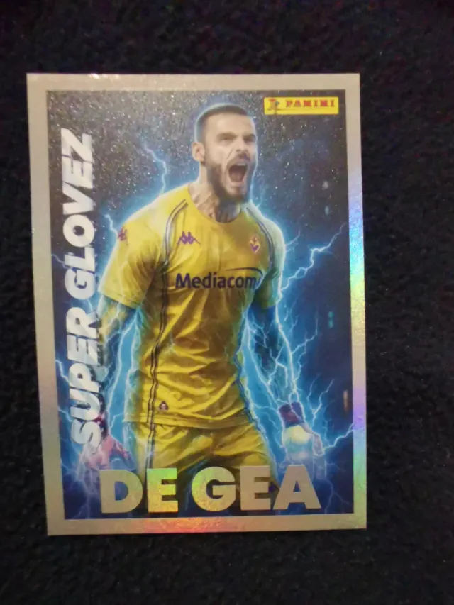 Figurina Panini dedicata a De Gea, con la dicitura Super Glovez. - Grafica con fulmini e sfondo stellato. - Cornice argentata. - Logo Panini visibile.