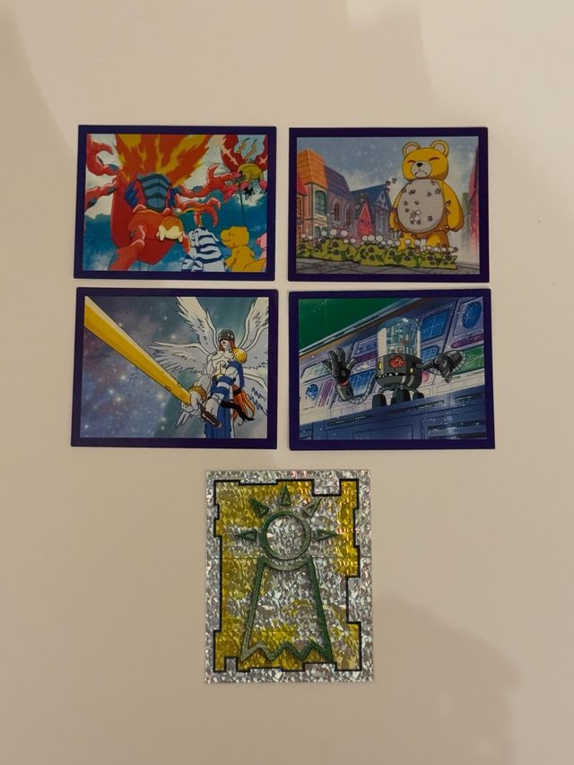 Set di 4 figurine Digimon con disegni a tema e 1 figurina speciale. - Illustrazioni colorate. - Personaggi iconici dei Digimon. - Elementi da collezione.