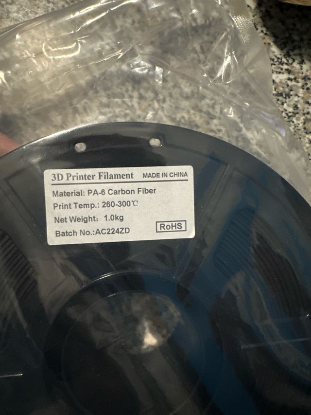 Filamento per stampante 3D in PA-6 Carbon Fiber. - Peso netto: 1.0kg - Temperatura di stampa: 260-300℃ - Certificazione RoHS - Codice lotto: AC224ZD