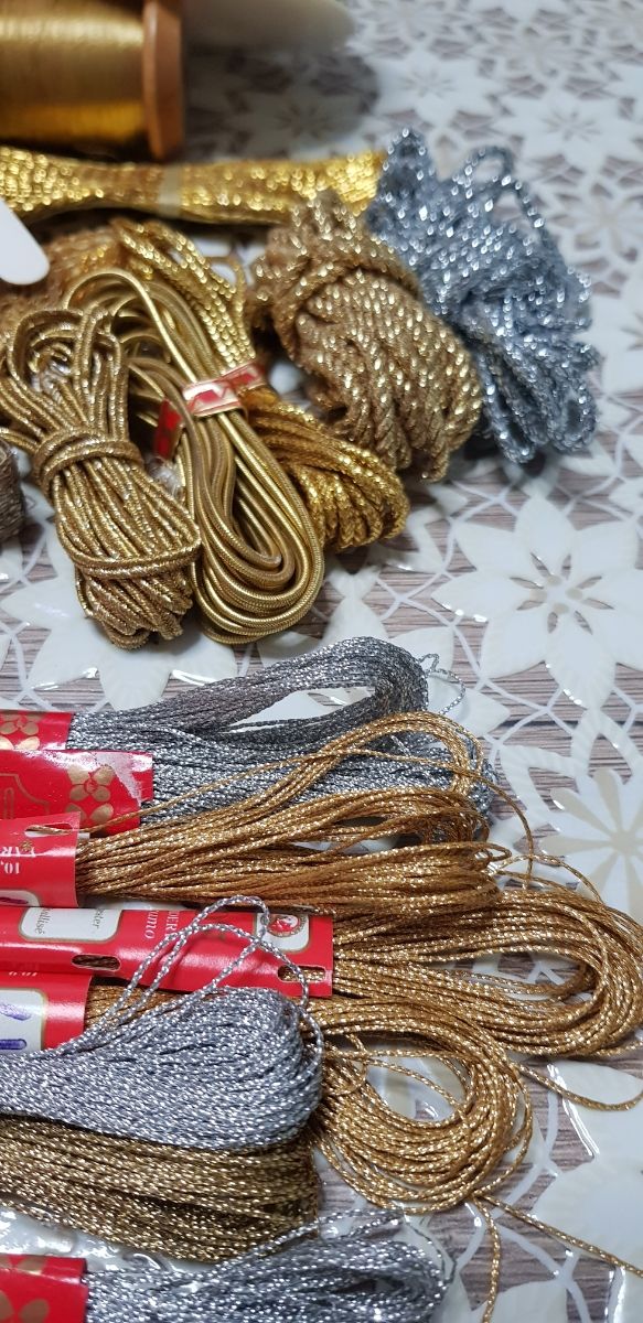 Vendo lotto di filati e rocchetti metallici di argento e oro per ricamo come in foto. Misure del prodotto