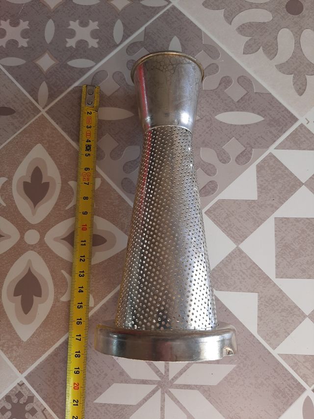 Questo filtro passapomodoro è realizzato in metallo lucido. - Design conico perforato. - Base stabile e piatta. - Finitura metallica.